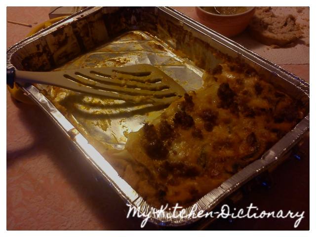 Queste lasagnette sono un’idea del nostro cuoco della mensa, Luigi. Ne ho assaggiate un pezzetto il giorno dopo, trovandole delicate e gustose. Ho fatto un’aggiunta di sapore, con la salsiccia, pensando ai miei uomini. Le abbiamo mangiate dalla nonna Piciu per l’ennesimo festeggiamento del compleanno di Pietro. Scusatemi per la foto, ma ci siamo dimenticati la macchina fotografica e anche la preparazione della scenografia, causa fame!